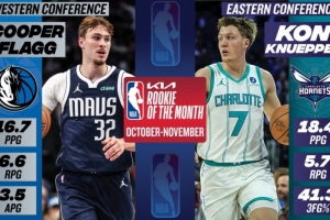 体育资讯12月3日讯 今日NBA官方公布了10-11月东西部月最佳新秀,状元弗拉格与黄蜂4号秀克尼佩尔分别当选。