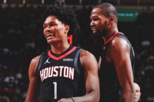赛后火箭官方晒出赢球海报,阿门·汤普森和杜兰特登上封面。