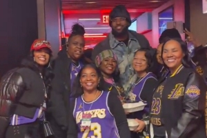 赛后,詹姆斯的一些家人们身穿他的球衣现身支援,詹姆斯送上合影和签名。